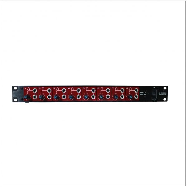 Amplificador de Fone profissional com 8 canais de alta potência Possui 8 saídas de fone padrão rack 19 com controle independente, 02 entradas input XLR, 2 saídas output XLR, conexões 1/4 trs e rca
