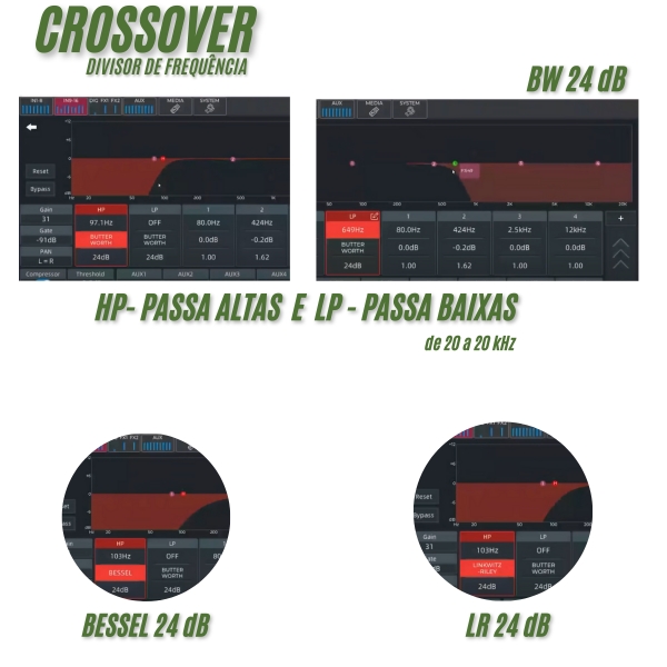 Que conte com 8 saídas auxiliares independentes ( AS SAÍDAS POSSUEM 8 EQUALIZADORES PARAMÉTRICOS + FILTROS PASSA ALTAS E BAIXAS DE 4° ORDEM (24dB) COM A OPÇÃO DE ESCOLHER O TIPO DE FILTRO LR, BW, BESSEL )