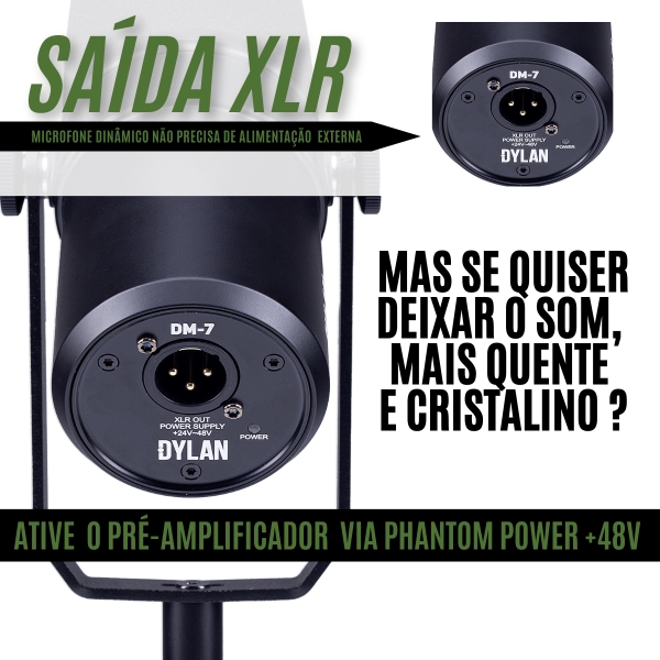 O DM-7 é um microfone dinâmico profissional para podcast com saída analógica XLR. Possui um pré-amplificador ativa via phantom power +48v, que deixa o som mais quente e cristalino.
