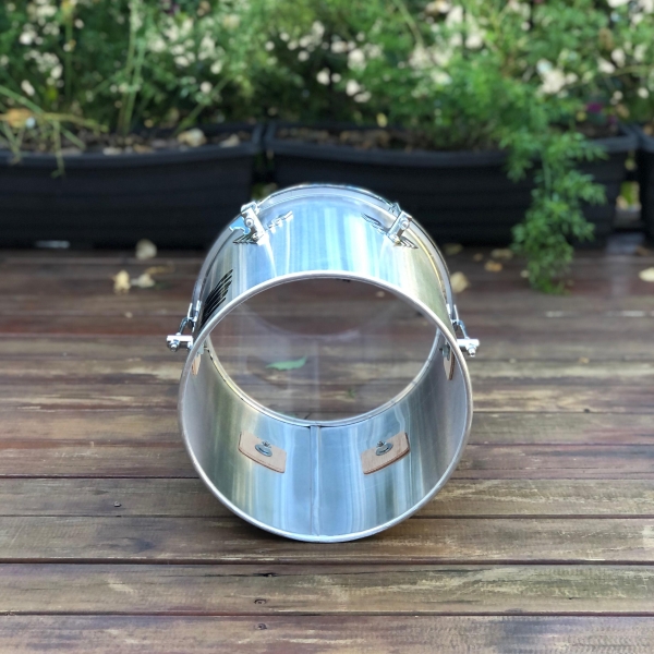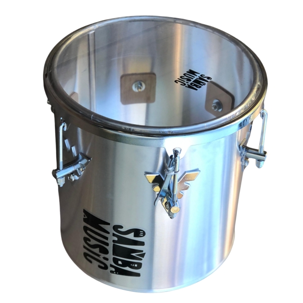 - Casco em alumínio, que proporciona ressonância alta e mais aguda e resistência ao uso intenso.